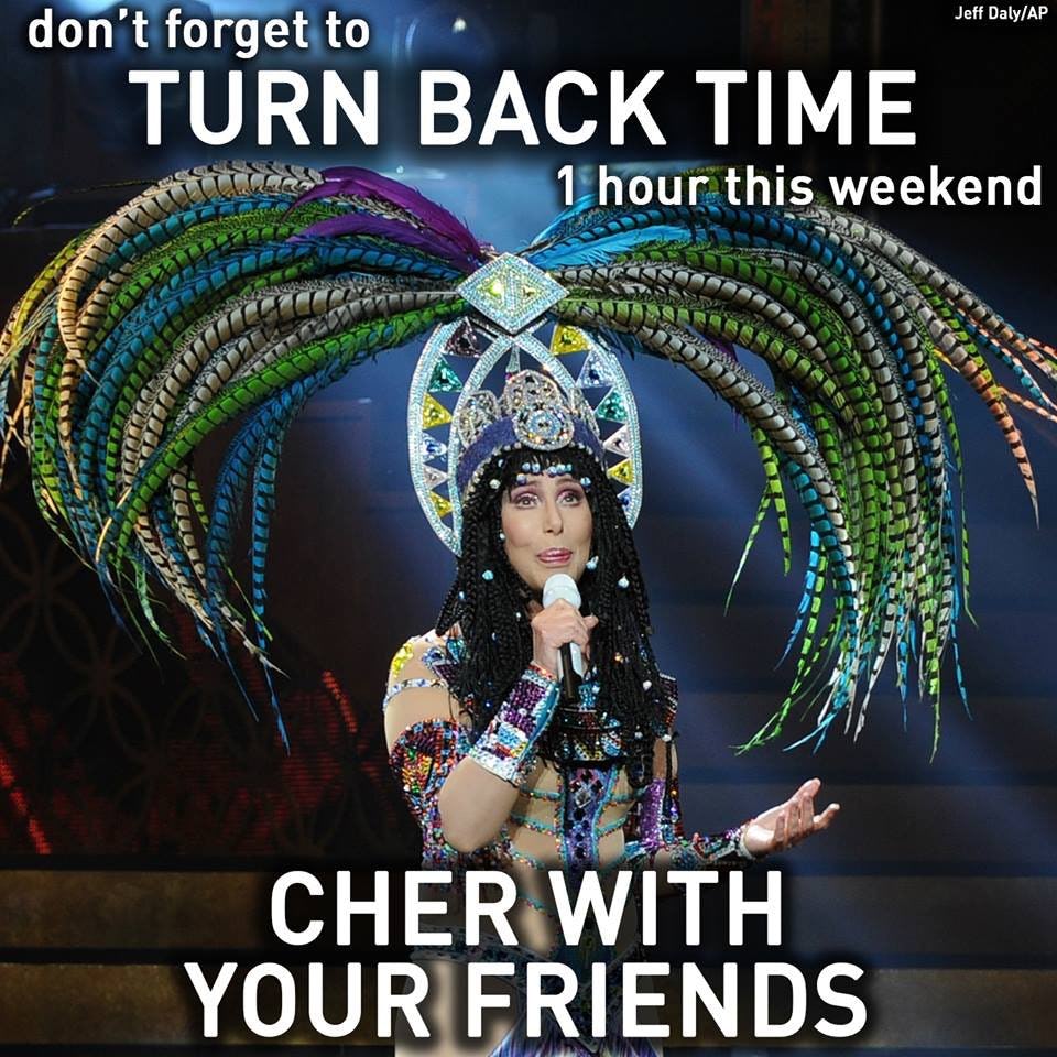 Cher turn back time daylight savings. Because of her turn back time song cher turn back time memes and daylight savings memes will forever reign. Just like cher americans will turn back their clocks on sunday night as daylight saving comes to a close. Only personal attacks are removed otherwise if its just content you find offensive you are free to browse other websites. Nov 1 2020 daylight saving time ends.