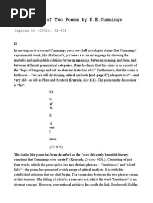 1a le af fa ll s one l iness. Returning to cummings brief poem which well call a leaf falls on loneliness for convenience sake we can analyse loneliness as the more general abstract universal theme or backdrop onto which or into which is inserted the local momentary observation of the falling leaf. Cummings even though theres a stunning array of color in autumn theres something inherently melancholy about watching the leaves drop. No longer a group of letters joined together to form words individual letters stand comparatively alone.
