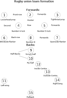 Rugby formation. In the game of rugby union there are 15 players on each team comprising eight forwards wearing jerseys numbered 18 and seven backs numbered 915. In addition there may be up to eight replacement players on the bench numbered 1623. In case something is wrong or missing kindly let us know by leaving a. Rugby the method of beginning play in which the forwards of each team crouch side by side with locked arms.